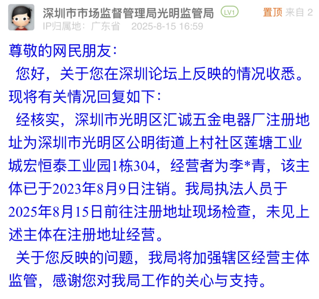 優(yōu)化建議:深圳市市場監(jiān)督管理局光明管理局的回應中,核實了涉事電器廠已注銷,且不在注冊地經(jīng)營,也提及加強轄區(qū)主體監(jiān)管,但市民反映的排插套用注銷主體信息銷售、違規(guī)標識3C標志等關鍵問題,未得到明確解答。若回應中能豐富指引類內(nèi)容,如告知市民可向平臺追責的途徑、提交證據(jù)的具體方式,為市民維權提供清晰方向,將更貼合市民需求,也能讓回應更具實際意義。