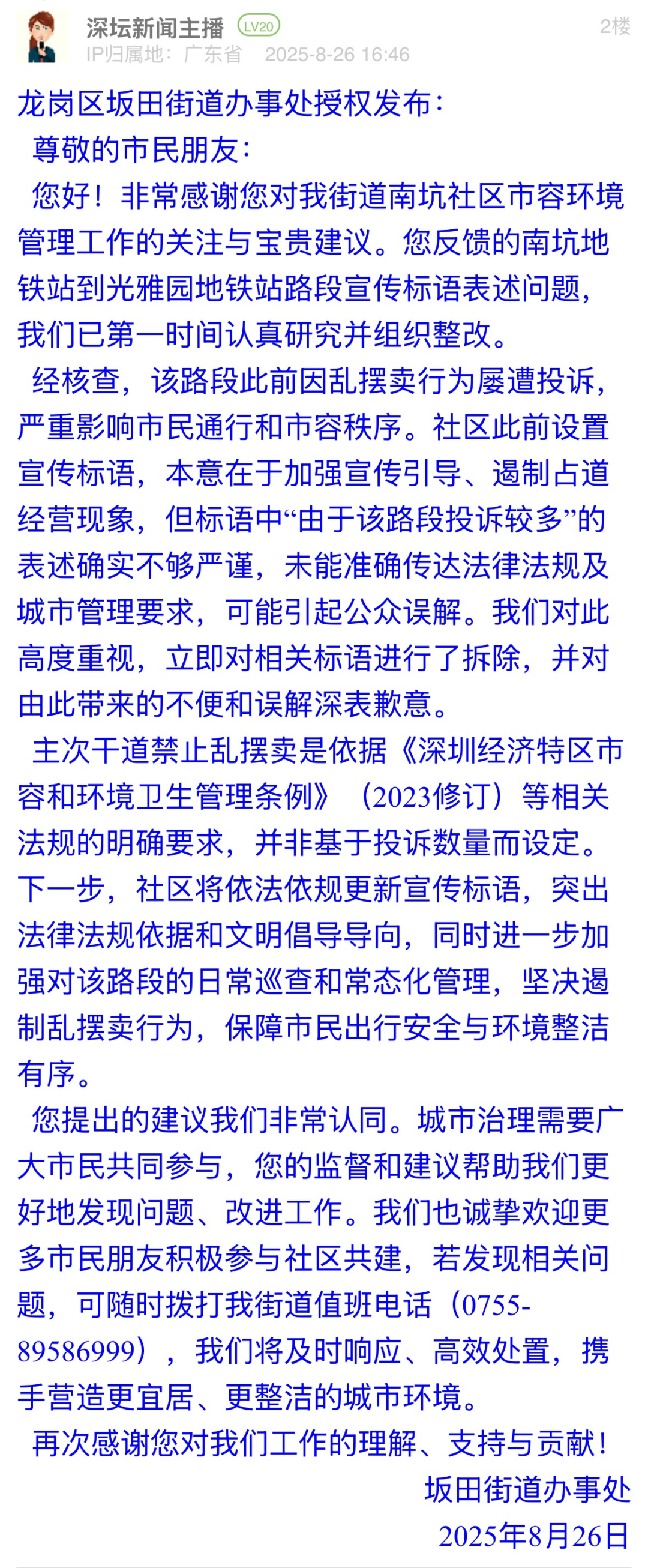 案例點評:標語表述不嚴謹可能引發(fā)公眾誤解,坂田街道辦展現(xiàn)出高效務實的態(tài)度,第一時間拆除涉事標語,計劃更新標語,明確標語中提及的禁擺依據(jù)為法規(guī)要求而非投訴數(shù)量。回應中,街道主動致歉并公開整改邏輯,展現(xiàn)“直面問題不推諉”的擔當,更以“邀請市民參與共建”為切入點,構建“政府主導+公眾監(jiān)督”的治理閉環(huán)。此次整改有效化解因標語表述不當引發(fā)的公眾疑慮,彰顯了“以民為師”的共治智慧。
