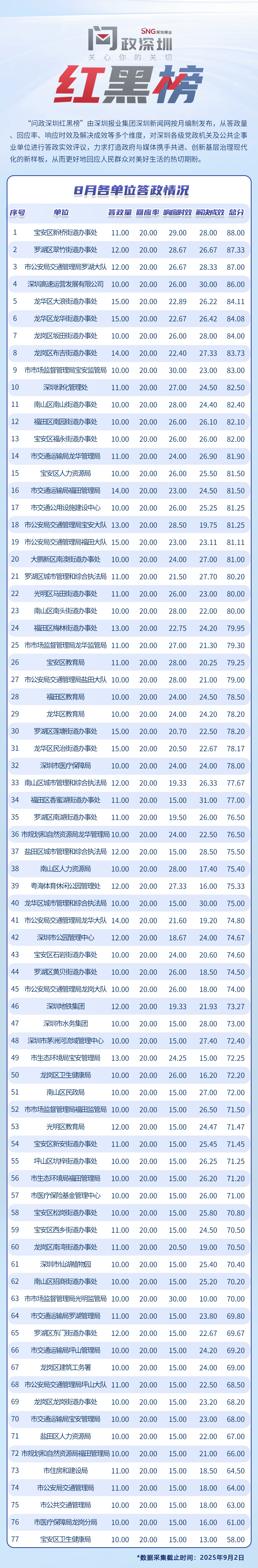 為探尋媒體如何精準賦能基層治理現(xiàn)代化的“深圳路徑”,深圳報業(yè)集團正式掛牌成立“問政深圳”工作室,旨在進一步推動網(wǎng)絡問政工作的高效開展。為確保相關工作更加契合實際需求,自上期起,深圳報業(yè)集團深圳新聞網(wǎng)按照“最快速度辦結”的總體要求,將原有月度榜單創(chuàng)新升級為“問政深圳紅黑榜”,并對評分體系進行了細致優(yōu)化。該榜單從答政量、回應率、響應時效及解決成效等多個維度,對深圳各級黨政機關及公共企事業(yè)單位進行答政實效評議,力求打造政府與媒體攜手共進、創(chuàng)新基層治理現(xiàn)代化的新樣板,從而更好地回應人民群眾對美好生活的熱切期盼。