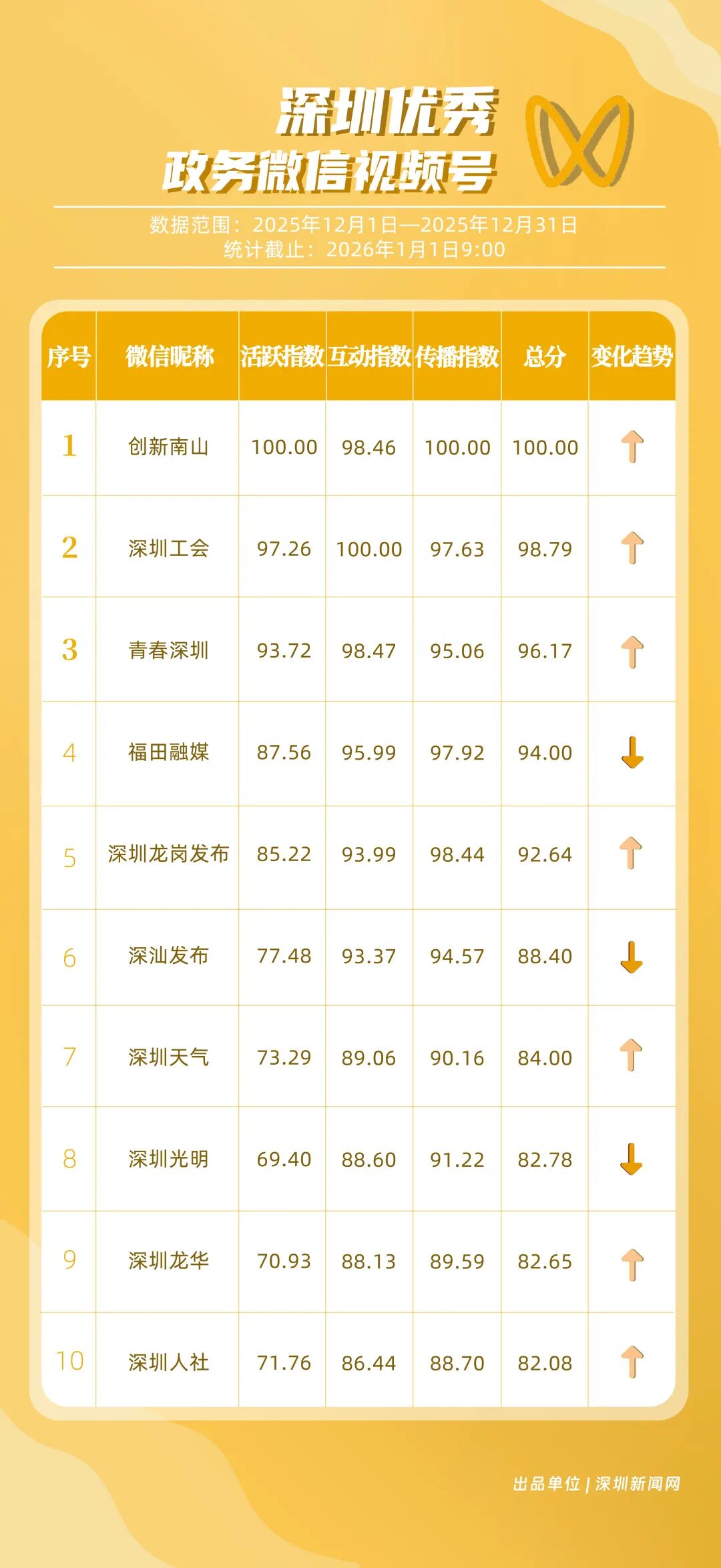 12月,“創(chuàng)新南山”“深圳工會”“青春深圳”“福田融媒”“深圳龍崗發(fā)布”“深汕發(fā)布”“深圳天氣”“深圳光明”“深圳龍華”“深圳人社”榮獲“優(yōu)秀政務(wù)微信視頻號”稱號。“創(chuàng)新南山”活躍指數(shù)、傳播指數(shù)均獲滿分,月作品總轉(zhuǎn)發(fā)量超70萬,領(lǐng)跑榜單;“深圳工會”積極發(fā)布熱點(diǎn)、民生類內(nèi)容,精準(zhǔn)對接市民需求,排名上升至第二名;“青春深圳”互動(dòng)指數(shù)超98分,以高互動(dòng)量位列榜單第三名。“福田融媒”“深圳龍崗發(fā)布”兩賬號立足區(qū)域特色深耕內(nèi)容,得分超90分。上榜微信視頻號以輕量化短視頻為載體,傳播公眾喜聞樂見的政務(wù)、民生內(nèi)容,打造出兼具傳播力與親和力的政務(wù)宣傳新名片。
