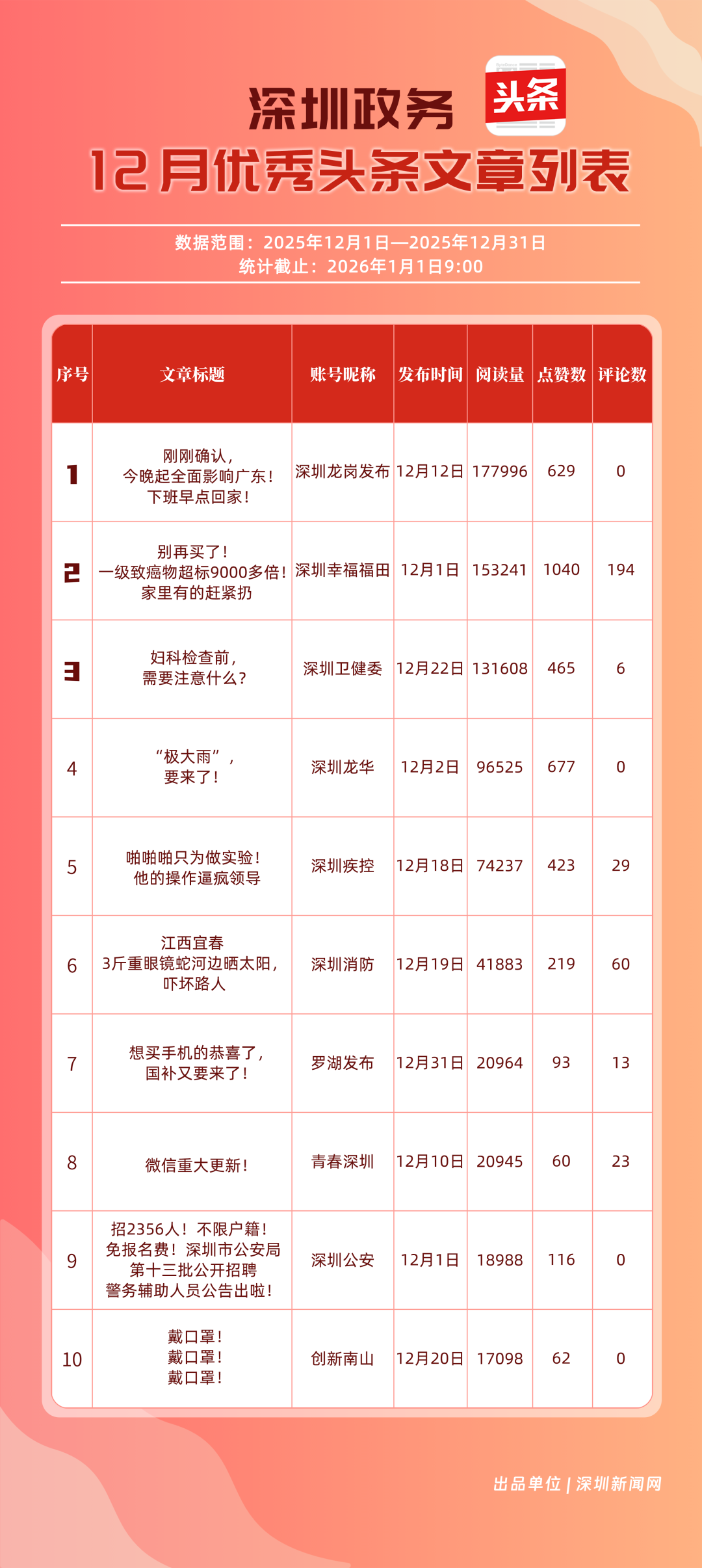 2025年12月期《深圳優(yōu)秀政務(wù)新媒體矩陣》正式發(fā)布,本期上榜矩陣以“接地氣、有溫度、強(qiáng)互動(dòng)”的創(chuàng)作理念,立足民生關(guān)切、深挖區(qū)域特色,以多元?jiǎng)?chuàng)新實(shí)踐在政務(wù)傳播賽道強(qiáng)勢突圍,展現(xiàn)深圳城市發(fā)展、文化傳承的生動(dòng)圖景,為政務(wù)新媒體高質(zhì)量發(fā)展注入澎湃動(dòng)能。