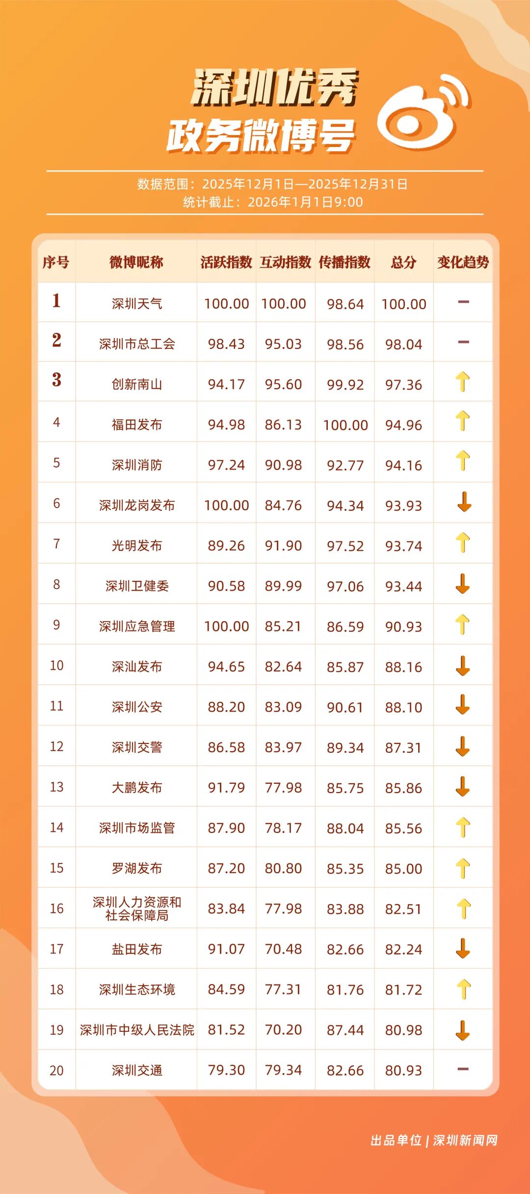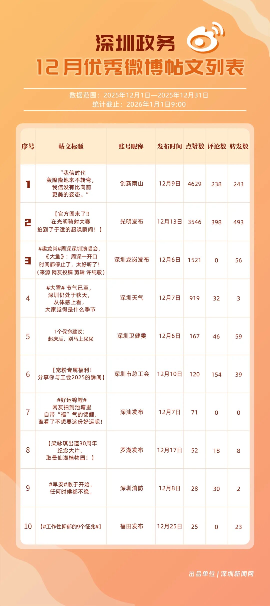 12月,20個(gè)賬號入選“優(yōu)秀政務(wù)微博號”榜單,其中包括:“深圳天氣”“深圳市總工會”“創(chuàng)新南山”“福田發(fā)布”“深圳消防”“深圳龍崗發(fā)布”“光明發(fā)布”“深圳衛(wèi)健委”“深圳應(yīng)急管理”“深汕發(fā)布”等。其中,“深圳天氣”精準(zhǔn)化發(fā)布天氣信息,高頻次與網(wǎng)民互動(dòng),以滿分成績蟬聯(lián)榜首,彰顯其在民生服務(wù)領(lǐng)域的核心價(jià)值;“深圳市總工會”積極發(fā)布互動(dòng)、福利類內(nèi)容,獲得較高用戶參與度與賬號影響力,居于榜單第二;“創(chuàng)新南山”傳播指數(shù)得分超99分,躋身榜單第三?!案L锇l(fā)布”“深圳消防”等賬號聚焦民生熱點(diǎn)、強(qiáng)化互動(dòng)運(yùn)營,居于榜單前列,且排名有所提升。12月上榜政務(wù)微博賬號持續(xù)發(fā)力,實(shí)現(xiàn)了政務(wù)信息的有效傳播,為政務(wù)新媒體的內(nèi)容運(yùn)營與價(jià)值傳遞提供了可借鑒的實(shí)踐樣本。