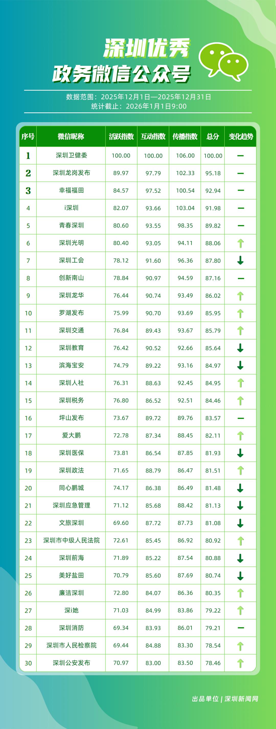 12月,“深圳衛(wèi)健委”“深圳龍崗發(fā)布”“幸福福田”“i深圳”“青春深圳”“深圳光明”“深圳工會”“創(chuàng)新南山”“深圳龍華”“羅湖發(fā)布”等30個(gè)政務(wù)微信公眾號榮登“深圳優(yōu)秀政務(wù)微信公眾號”榜單。12月榜單中,頭部政務(wù)賬號優(yōu)勢穩(wěn)固,腰部賬號競爭激烈?!吧钲谛l(wèi)健委”延續(xù)強(qiáng)勁表現(xiàn),在活躍、互動(dòng)、傳播維度均斬獲滿分,60余篇文章閱讀超10萬,蟬聯(lián)榜首;“深圳龍崗發(fā)布”在互動(dòng)、傳播方面表現(xiàn)亮眼,穩(wěn)居榜單第二;“幸福福田”也在互動(dòng)、傳播方面具備一定優(yōu)勢,以穩(wěn)定的內(nèi)容輸出與用戶口碑,居于榜單第三?!吧钲诠饷鳌薄吧钲邶埲A”“羅湖發(fā)布”等政務(wù)賬號不斷拓展信息發(fā)布維度、深化服務(wù)場景打造,排名較上期有所提升。上榜微信公眾號以高質(zhì)量內(nèi)容為核心競爭力,在政務(wù)傳播賽道持續(xù)發(fā)力,為推動(dòng)政務(wù)信息公開、服務(wù)民生需求搭建了高效的溝通橋梁。