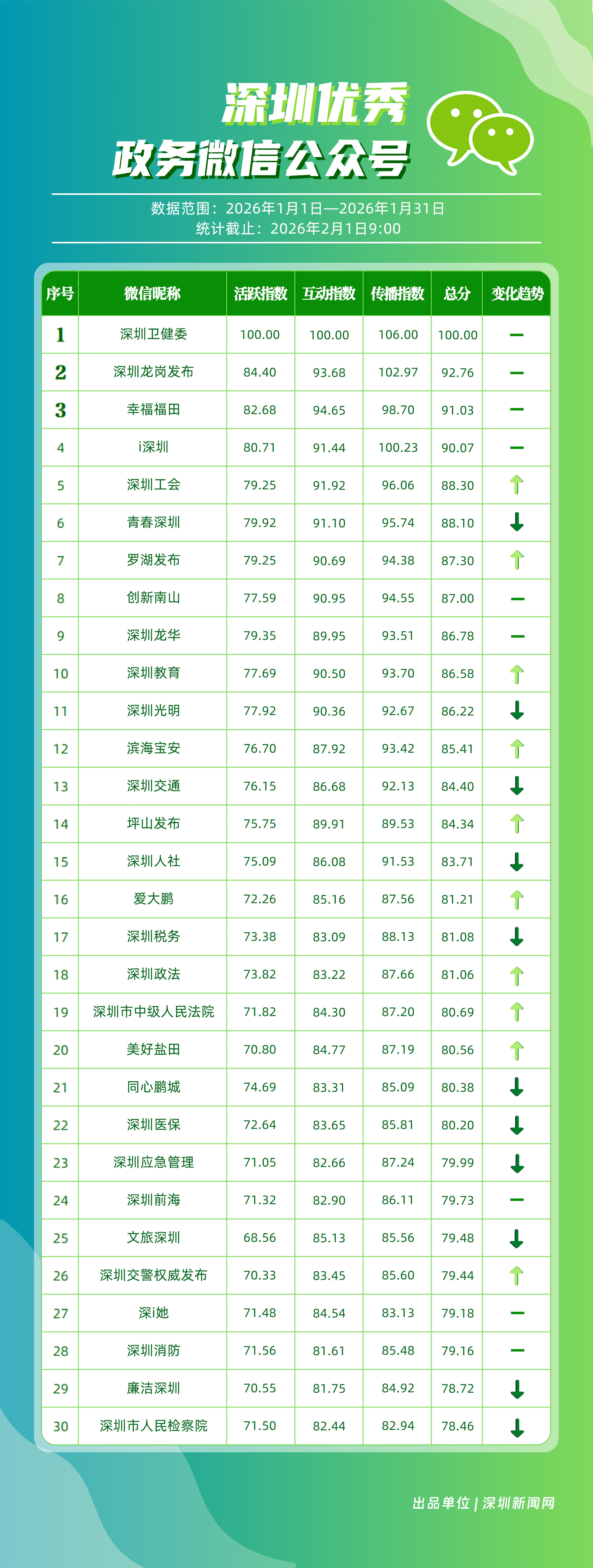 2026年1月,“深圳衛(wèi)健委”“深圳龍崗發(fā)布”“幸福福田”“i深圳”“深圳工會(huì)”“青春深圳”“羅湖發(fā)布”“創(chuàng)新南山”“深圳龍華”“深圳教育”等30個(gè)政務(wù)微信公眾號(hào)榮登“深圳優(yōu)秀政務(wù)微信公眾號(hào)”榜單。1月,頭部賬號(hào)“深圳衛(wèi)健委”繼續(xù)保持領(lǐng)先優(yōu)勢(shì),1月份有59篇文章閱讀量突破10萬次,總分100分,穩(wěn)居榜首;“深圳龍崗發(fā)布”在互動(dòng)與傳播方面表現(xiàn)依然出色,總分102.97分,位列第二;“幸福福田”憑借均衡、穩(wěn)健的運(yùn)營(yíng),在互動(dòng)與傳播方面表現(xiàn)優(yōu)異,總分91.03分,排名第三。同時(shí),“深圳工會(huì)”與“羅湖發(fā)布”等賬號(hào)排名相較2025年12月有所提升。上榜微信公眾號(hào)持續(xù)深耕內(nèi)容與服務(wù),不斷拓展發(fā)布維度與深化應(yīng)用場(chǎng)景,在提升政務(wù)信息傳播效能、精準(zhǔn)對(duì)接民生需求方面,發(fā)揮了關(guān)鍵作用。