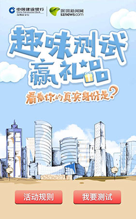 人在江湖漂~怎能沒(méi)有房!遵從內(nèi)心意志完成測(cè)試,即可揭曉,在一個(gè)滿地是房子的城市中,你應(yīng)該擁有的真實(shí)身份, 有沒(méi)有勾起你的好奇心呢!快點(diǎn)參與到,由深圳新聞網(wǎng)與中國(guó)建設(shè)銀行深圳分行聯(lián)合發(fā)的小游戲中吧!游戲操作相當(dāng)簡(jiǎn)單,只要?jiǎng)觿?dòng)你的手指,勾選幾個(gè)選項(xiàng)即可,重點(diǎn)是完成測(cè)試還可抽取紅包哦!
